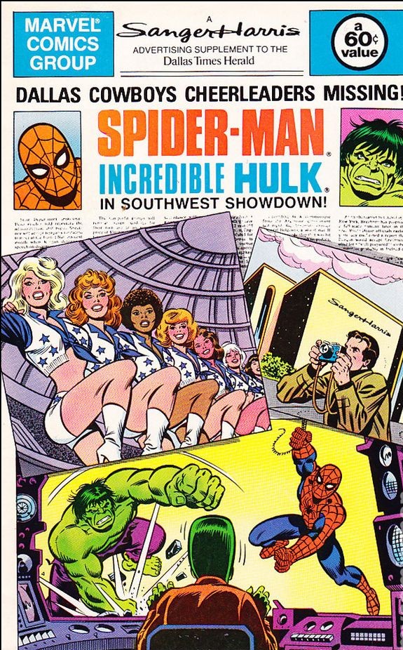 Spider-Man and the Incredible Hulk star in “Southwest Showdown” featuring the Dallas Cowboy Cheerleaders! Sanger Harris advertising supplement to the Dallas Times Herald. Standard comic format; full color; 32 newsprint pages