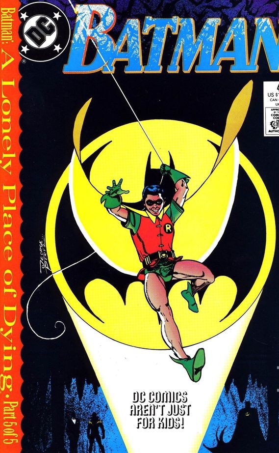 Direct Edition. Cover by George Perez. “A Lonely Place of Dying Chapter Five: Rebirth,” script by George Perez (Co-Plot) and Marv Wolfman, pencils by Jim Aparo, inks by Mike DeCarlo; With Batman and Nightwing trapped by Two-Face, there’s only one person left to save the day; Prepare for the debut of the newest Robin, Tim Drake!