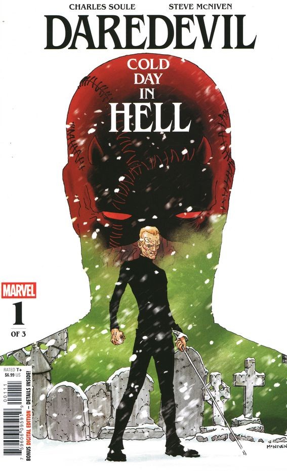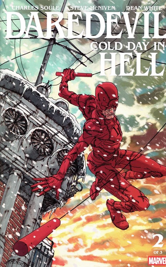 Written by Charles Soule. Art by Steve McNiven. Cover by Steve McNiven. HELL GONE COLD! After a horrific series of events, the world is in shambles. Matt Murdock is old, and his powers have faded to nothing. Matt will not, however, sit by and watch his fellow New Yorkers suffer, so instead of swinging around the city from his billy club line, he slings soup at a food center for the poor. But when a mysterious wrinkly old man interrupts a secret convoy causing an explosion, a deadly gas fills Hell’s Kitchen and this tale takes a turn that will change how you look at the Man Without Fear.