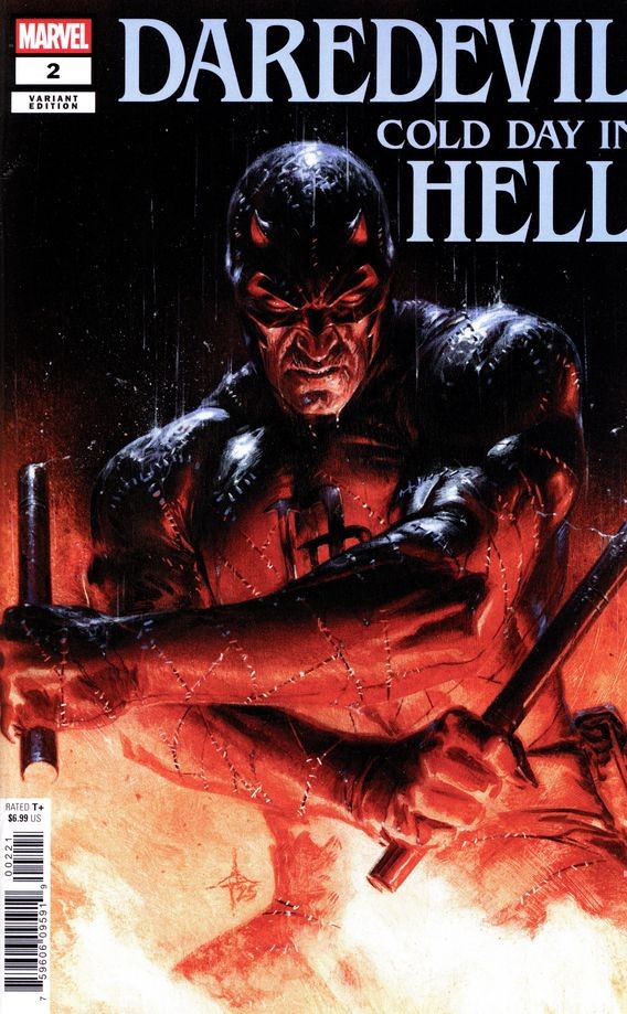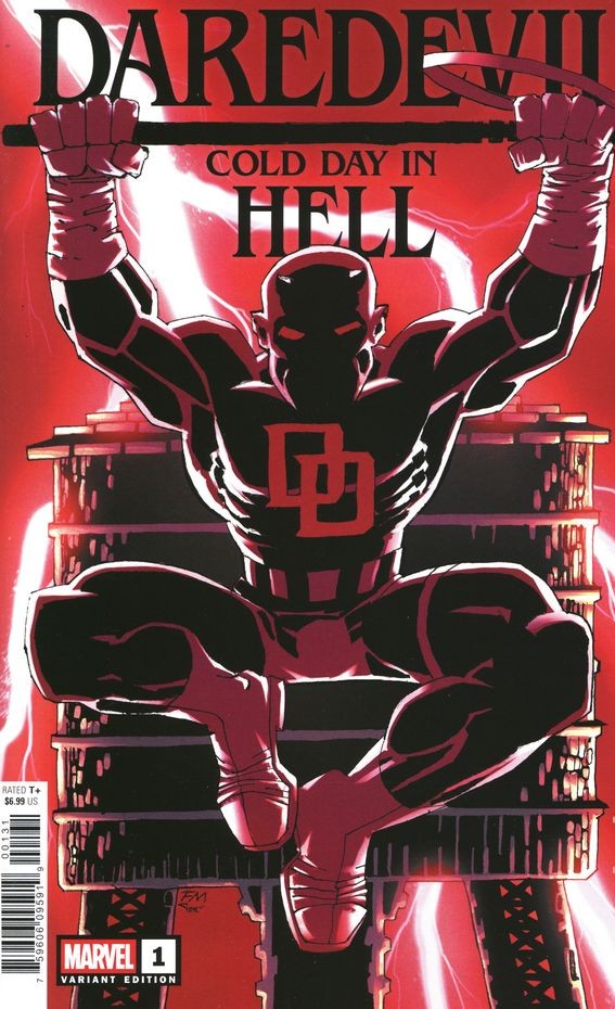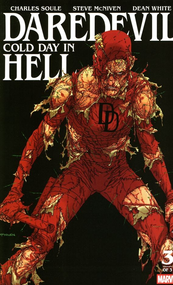 Written by Charles Soule. Art by Steve McNiven. Cover by Frank Miller. HELL GONE COLD! After a horrific series of events, the world is in shambles. Matt Murdock is old, and his powers have faded to nothing. Matt will not, however, sit by and watch his fellow New Yorkers suffer, so instead of swinging around the city from his billy club line, he slings soup at a food center for the poor. But when a mysterious wrinkly old man interrupts a secret convoy causing an explosion, a deadly gas fills Hell’s Kitchen and this tale takes a turn that will change how you look at the Man Without Fear.