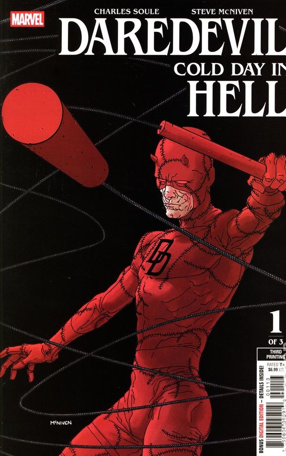 Written by Charles Soule. Art by Steve McNiven. Cover by Steve McNiven. HELL GONE COLD! After a horrific series of events, the world is in shambles. Matt Murdock is old, and his powers have faded to nothing. Matt will not, however, sit by and watch his fellow New Yorkers suffer, so instead of swinging around the city from his billy club line, he slings soup at a food center for the poor. But when a mysterious wrinkly old man interrupts a secret convoy causing an explosion, a deadly gas fills Hell’s Kitchen and this tale takes a turn that will change how you look at the Man Without Fear.