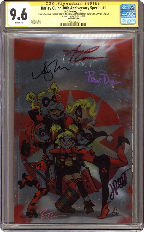 Paul Dini Edition Foil Virgin Cover by Amy Mebberson. Written by Amanda Conner, Jimmy Palmiotti, Paul Dini, Rafael Scavone, Sam Humphries, Stjepan Sejic, Rob Williams, Stephanie Phillips, Cecil Castellucci, Kami Garcia, Mindy Lee and Terry Dodson. Art by Chad Hardin, Guillem March, Rafael Albuquerque, Erica Henderson, Stjepan Sejic, John Timms, Riley Rossmo, Dan Hipp, Mico Suayan, Jason Badower, Terry Dodson and Rachel Dodson. You are cordially invited to an oversize extravaganza celebrating the Clown Princess of Crime’s 30th birthday in this fantabulous special! That’s right — Harley Quinn turns 30 in absolute style and has invited a squad of her old creative pals to join her with a killer lineup of amazing stories!