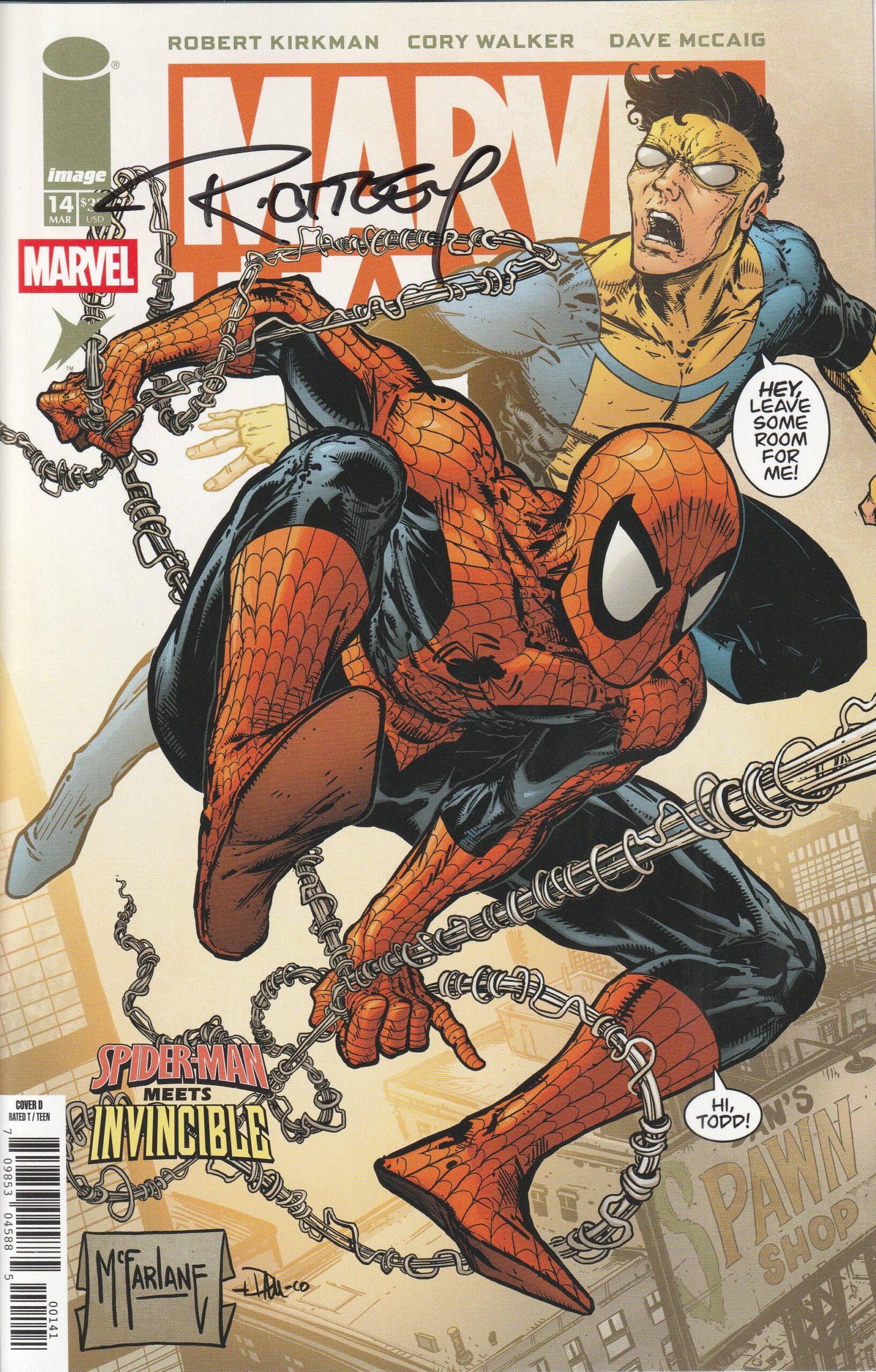 (W) Robert Kirkman (A) Cory Walker, Dave McCaig (CA) Todd McFarlane, Dave McCaig THE HISTORIC FIRST MEETING OF INVINCIBLE & MARVELS SPIDER-MAN! One of the most demanded comics of the modern era is available again as superstars ROBERT KIRKMAN & CORY WALKER present probably the best superhero team-up in the universe! With a star-studded variant cover artist lineup including Spider-Man legends Todd McFarlane, Erik Larsen, Ryan Ottley, and more, this is the comic that no superhero fan can miss! 24 pages, full color, rated T