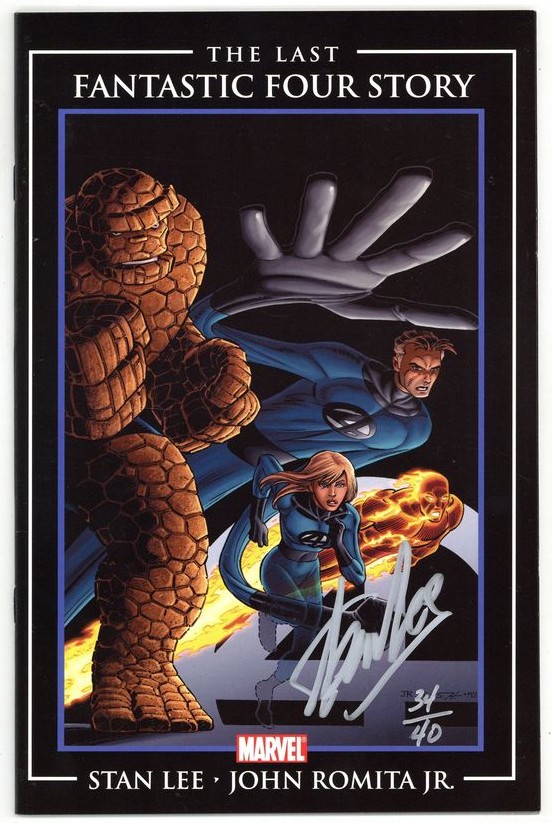 Dynamic Forces edition signed by Stan Lee and limited to 40 copies with certificate of authenticity. Written by STAN LEE Pencils and Cover by JOHN ROMITA JR. Legendary writer and Fantastic Four co-creator Stan Lee unites with artist John Romita Jr. to tell his final story of the team that started the Marvel age!