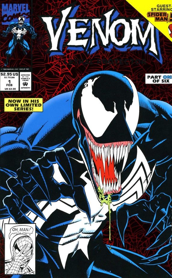 Direct Edition. Red Foil Enhanced CardStock cover, art by Mark Bagley and Sam de la Rosa. Lethal Protector Part 1: Dark Soul Drifting, script by David Michelinie, pencils by Mark Bagley, inks by Al Milgrom and Sam de la Rosa; Venom moves to San Fransisco to try out his new protection of innocents racket; Venom and Spidey save a group of homeless folk.