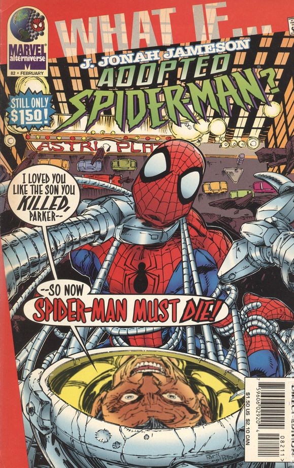 What if J. Jonah Jameson Adopted Spider-Man? J. Jonah Jameson adopts Peter Parker after Aunt May is killed; Chameleon, Betty Brant, Frederick Foswell, the Vulture, Flash Thompson, Spencer Smythe, Scorpion, Sandman, and Doctor Octopus appear. Script by William Messner-Loebs, pencils by Anthony Williams, inks by Andy Lanning Cover pencils by Paris Cullins, inks by Bob Petrecca.